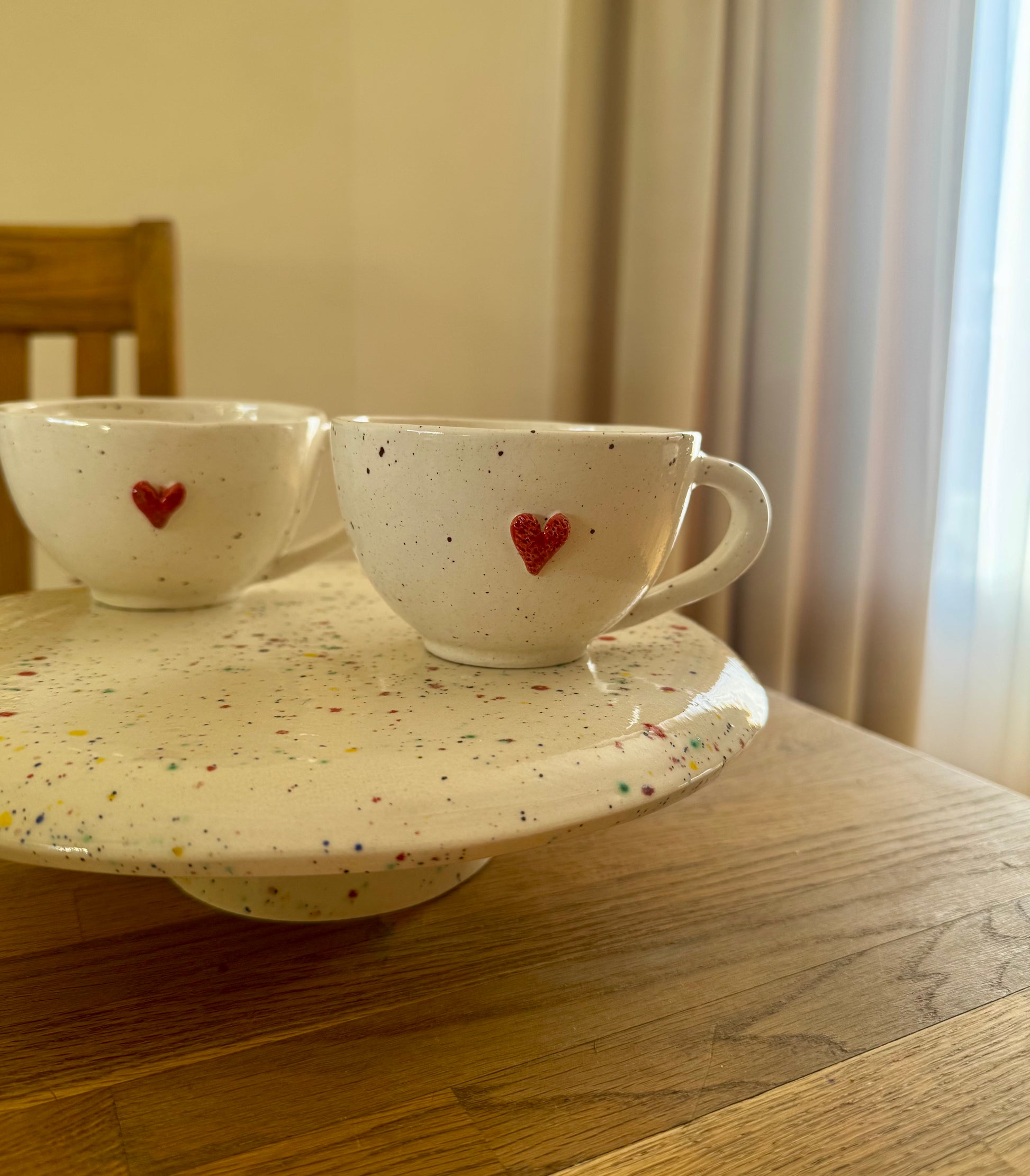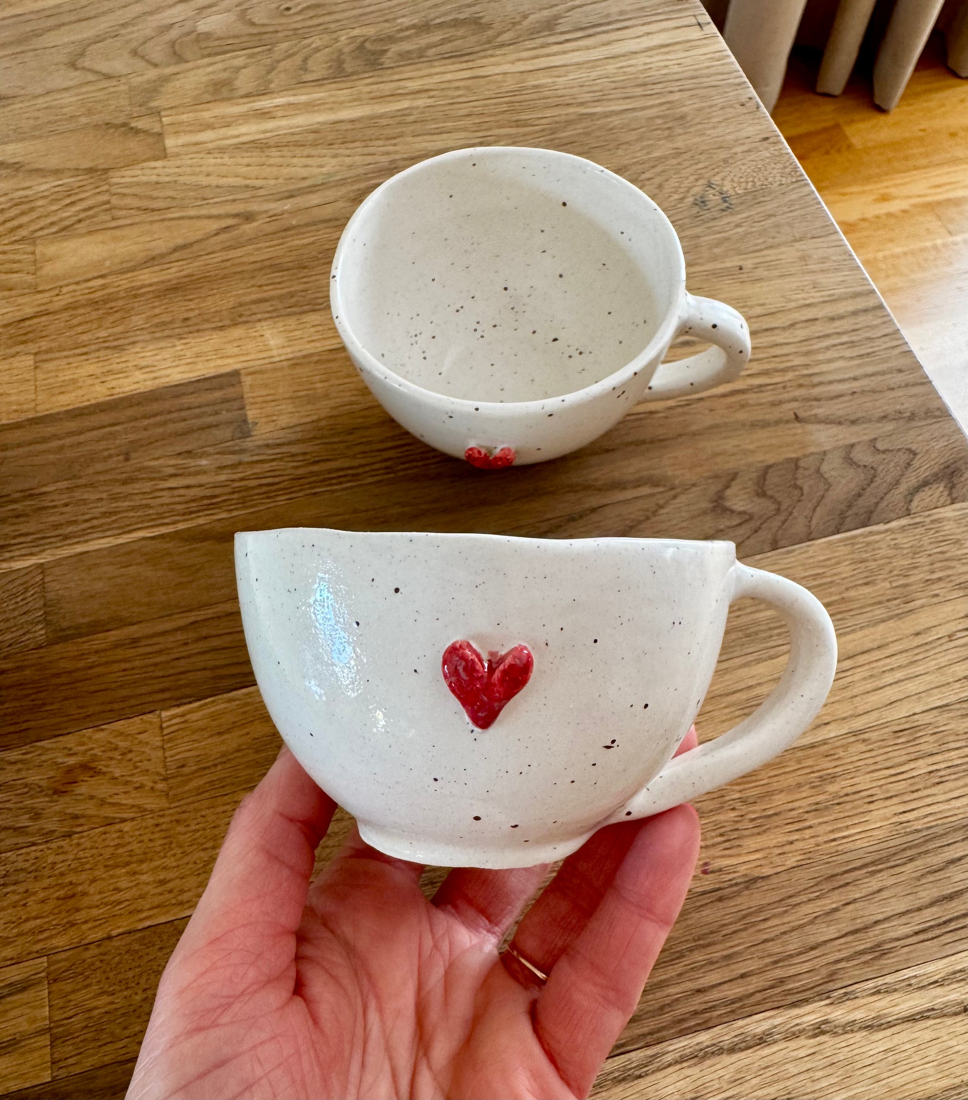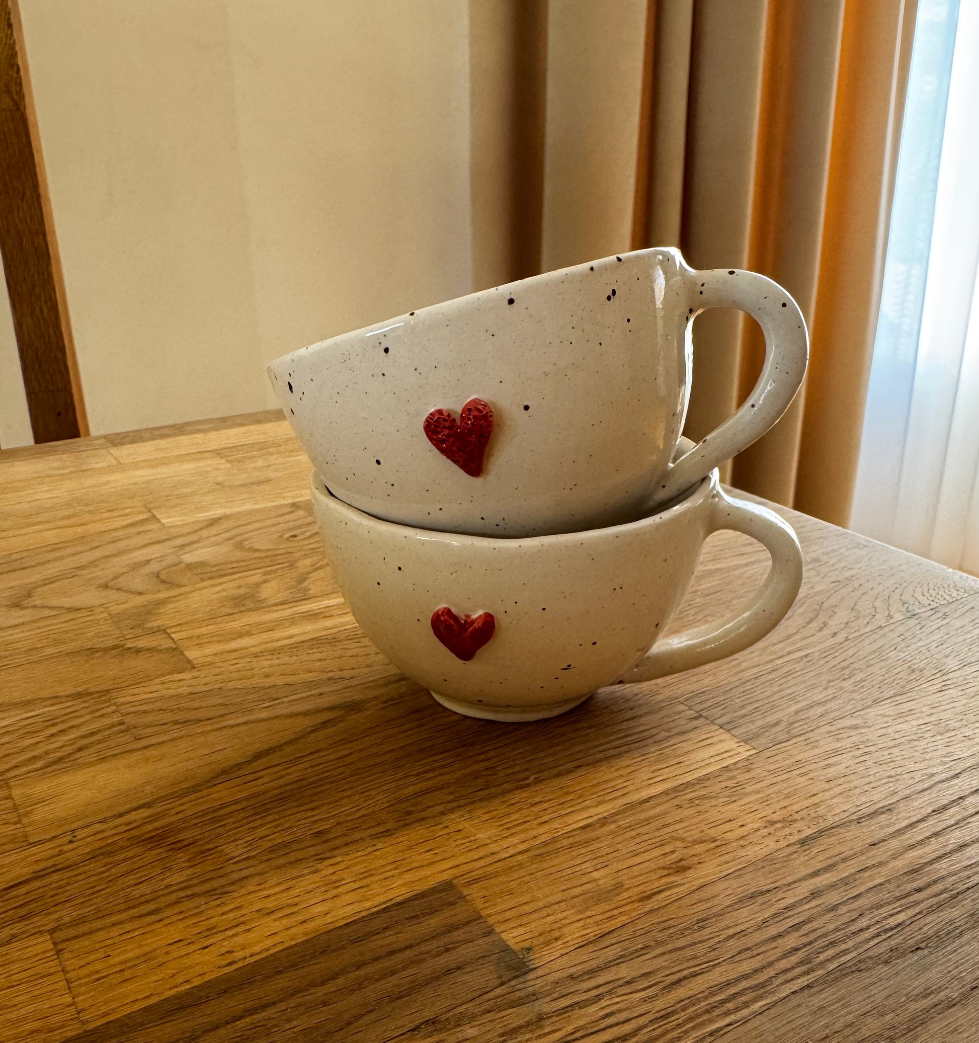 Šis rankų darbo keraminis puodelis– tai ne tik indas, bet ir meilės žinutė sau ar artimiesiems. Maža raudona širdelė ant kreminės glazūros sukuria jaukumą ir šilumą. Puikus pasirinkimas tiems, kurie vertina rankų darbo gaminius ir mėgsta pradėti dieną su šypsena.